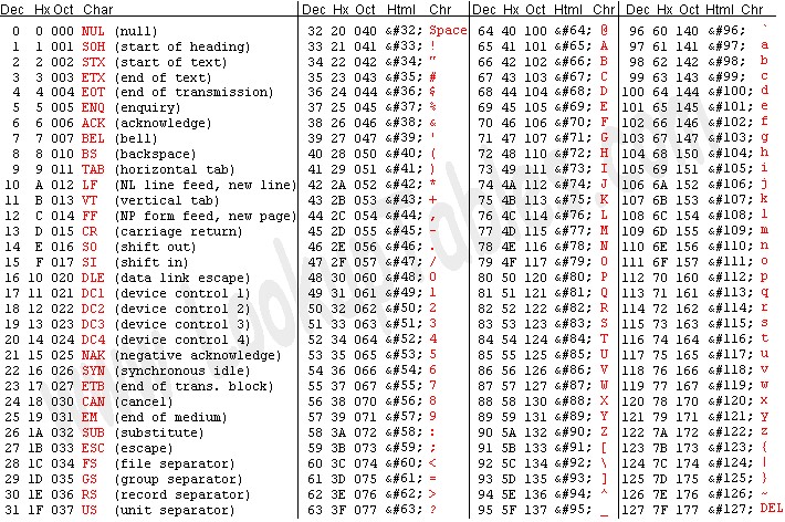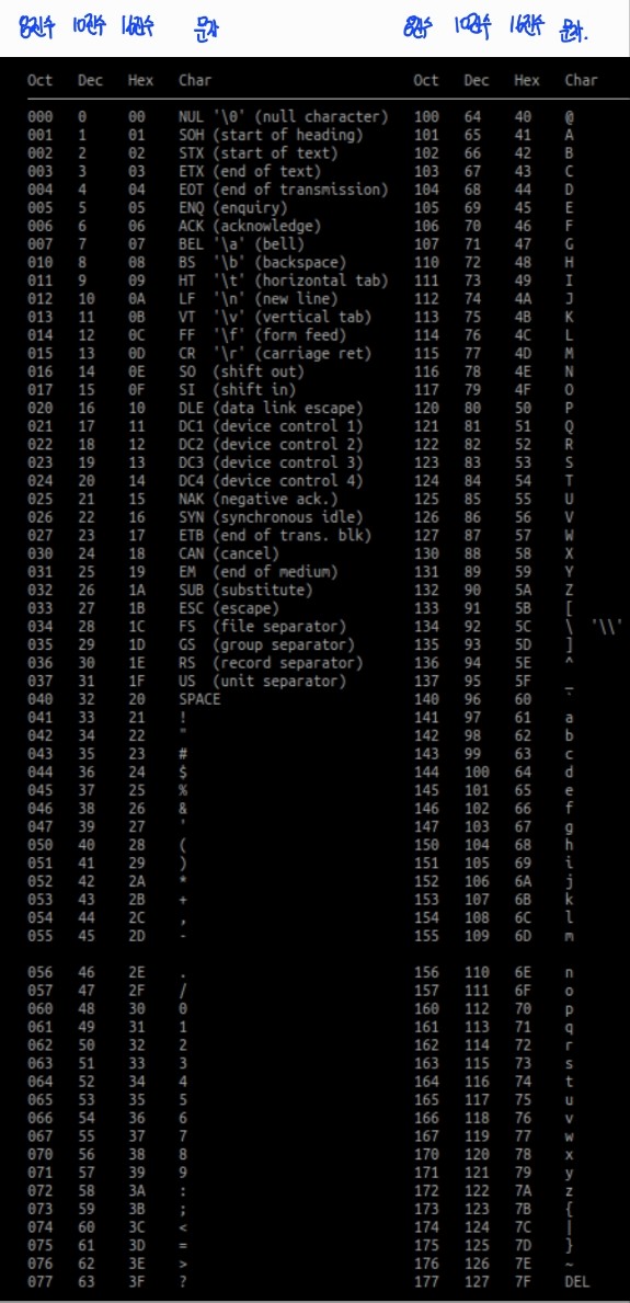리눅스 사용자 유저분이시라면, 터미널에 'man ascii'라고 작성을 해주시면 ascii코드를 보실 수 있으십니다.